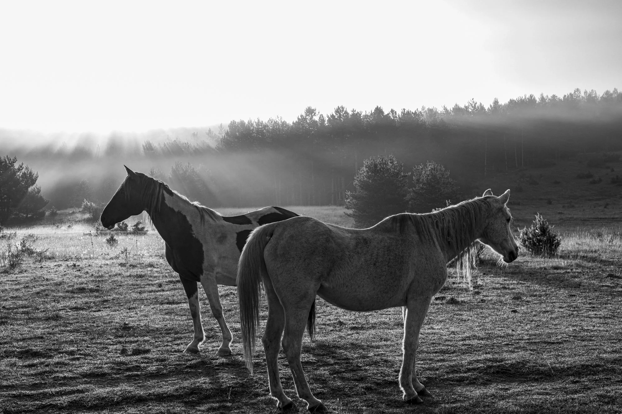 Les Cévennes offrent des contrastes qui frappent immédiatement : les grands plateaux balayés par le vent succèdent à des vallées abruptes où les pierres granitiques dressent leurs formes insolentes, comme autant de défis lancés à la gravitation. Certaines se tiennent là, isolées, tel un cheval de Troie perdu, figé dans un combat dont personne ne connaît plus l’issue. Et puis il y a la brume. Cette brume que nous avons cherchée par monts et par vaux, espérant surprendre la lumière au moment précis où elle hésite, où elle flotte avant de se déposer.